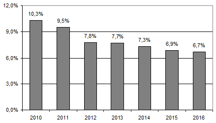 Присоединение Китая к ВТО способствовало значительному росту ВВП страны. По данным МВФ ВВП Китая вырос с 1,2 трлн. долл. в 2000 г. до 11,4 трлн. долл. в 2016 г. [1]. Однако с 2010 г. темпы роста ВВП Китая замедляются. Согласно данным Государственного статистического управления КНР в 2010 г. ВВП Китая увеличился на 10,3%, а за последние два года темпы прироста ВВП составляют менее 7% (рис. 1) [2].