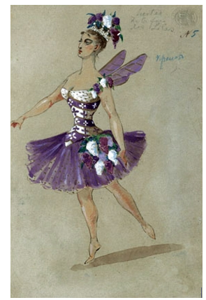 Одеяние феи Сирени, созданное первоначально Всеволожским для пролога [4, л. 3] так и не был осуществлен. В обоих случаях это традиционный тюник. В копии по костюму рассыпаны цветы сирени, которые столь естественно «обозначают» персонаж. Некоторое своеобразие ему придает пара изящных крыльев на плечах и шапочка-венок. Платье и шапочку объединяют в единый декоративный ансамбль маленькие гирлянды из цветов. Создается образ исполненной гармонии и некоторой воздушной фантастичности – столь традиционной в романтическом балете и в балете феерии («Сильфида», «Жизель», традиционные образы Марии Тальони).
