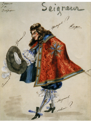 Костюмы пролога и первого действия в основном выдержаны в традициях костюмов ренессансной Франции, но некоторые из них несут очевидные черты эпохи средневековья. Особенно заметно это в эскизе костюма вельможи [6, л. 10] - образце типичного костюма того времени. То есть это некое художественно-условное время средневековья и Возрождения (точнее, в первую очередь Возрождения, но отчасти и средневековья). Костюмы и декорации спектакля переносят нас в условное время. Это выявляется в спектакле также тем, что по замыслу Всеволожского третье действие спектакля выражает некий золотой век человечества, в который оно вступает волшебно преображенным.