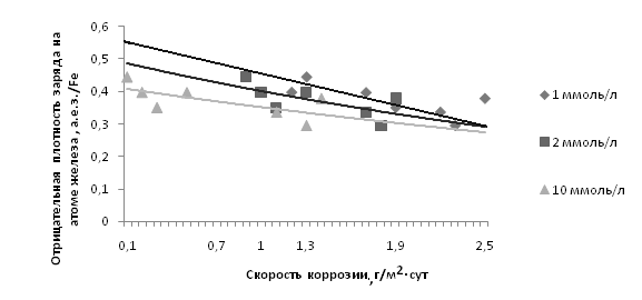 Очевидно, что в концентрации 1 мМоль/л такая зависимость наиболее сильна, т.е. на более резкое увеличение плотности заряда на железе приходится более резкое уменьшение скорости коррозии. При концентрациях выше такая зависимость сохраняется, но выражается менее резко. При скорости коррозии 2,5 г/м2∙сут зависимость скорости коррозии от зарядовой плотности на железе теряется, последняя принимает стабильное значение Feρq= - 0,300.