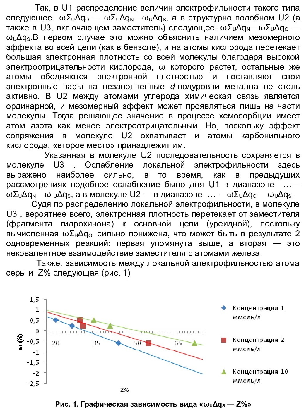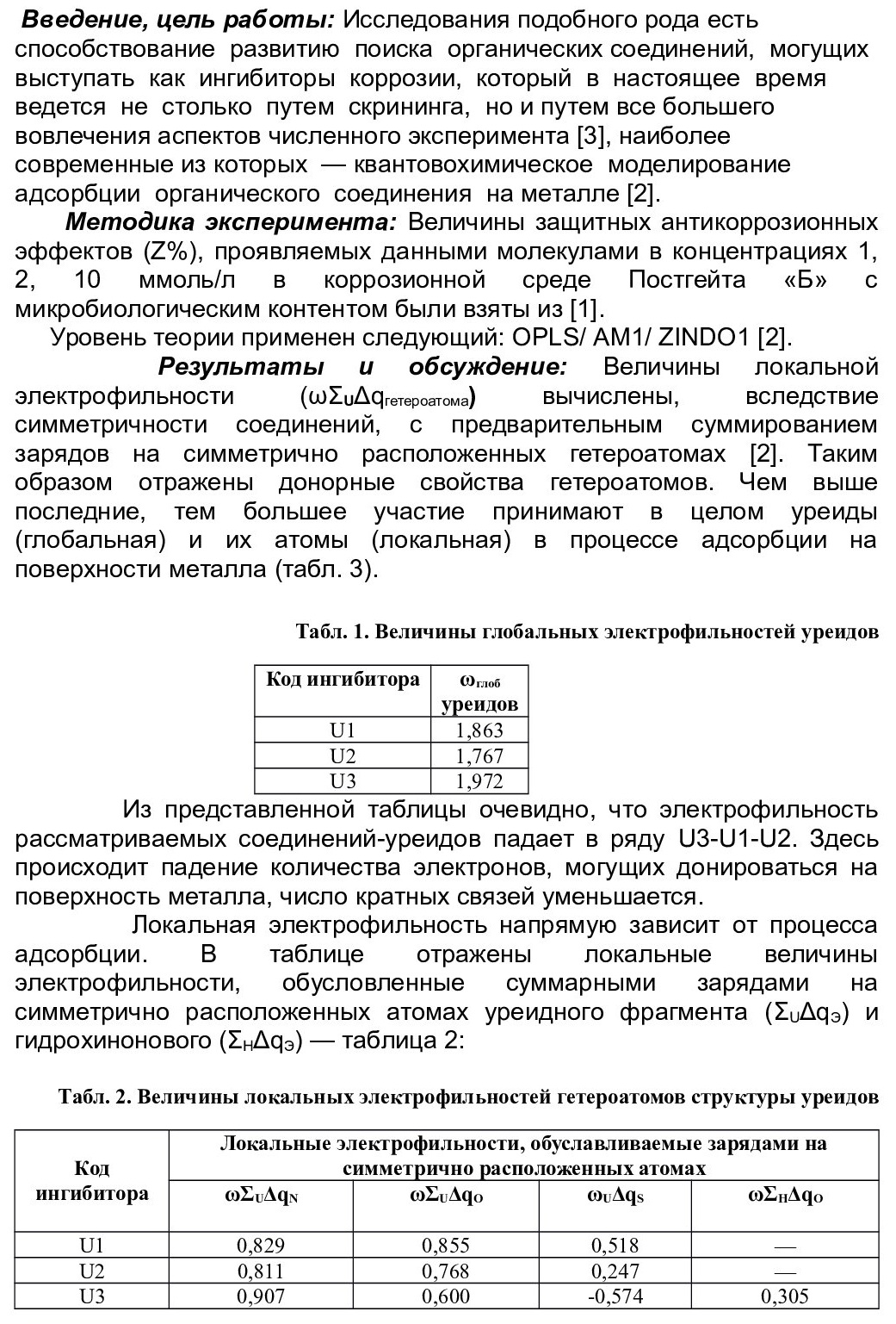Abstract. In published work presents modeled using quantum chemical package HyperChem version 8.0.7 using the semiempirical method ZINDO/1, the process of adsorption of organic compounds of ureidе ranging from simple to more complex, a cluster of iron (present in the steel in amounts of 97%). This approach, as will be shown, with high accuracy reflects the process of corrosion protection with bacterial content by chemisorption of organic compounds on the metal surface with the formation of complex compounds. In the research process were obtained and analyzed global and local electrophilicity heteroatoms, reflects the composition of the complexes, lit a graph showing the dependence of the local electrophilicity from protective anti-corrosion effect.