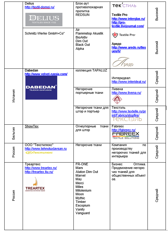 В рамках работы проанализирован рынок производителей трудновозгорамых тканей для штор, а также поставщиков в России (табл.3).