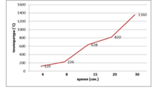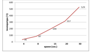 На рис. 6 показан график возможной максимально достигнутой температуры на установке в течении 30 секунд с пятью интервалами времени. На рис. 7 продемонстрирована температура на поверхности образца после воздействия открытого пламени. На рис. 8, 9 показана градация риска (имитация) возможного нанесения ожога работнику, если бы он был одет в спецодежду из данной ткани, - после воздействия открытого пламени.