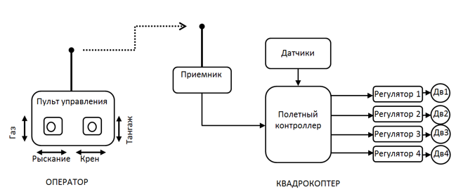 Система управления мультикоптеров, которая называется полетным контроллером, является «мозгом» летательного аппарата. К ней относятся не только элементы, обеспечивающие управление, но и устройства, отвечающие за телеметрию, и передачу данных. Обобщенной задачей полетного контроллера является несколько десятков раз в секунду выполнять цикл управления, в который входит: считывание показаний датчиков, считывание каналов управления, обработка информации и выдача управляющих сигналов моторам, чтобы выполнять команды пилота.