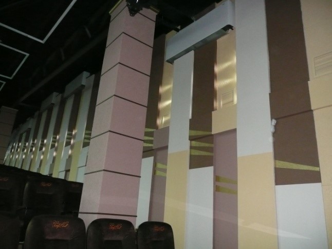Опыт применения сертифицированных отделочных материалов с огнезащитной функцией, приведу на примере проектирования и реализации строительством помещения конференц-холла, конференц-зала многофункционального использования «Сити-Холл» на 630 мест, в составе комплекса торгово-развлекательного в г. Южно-Сахалинске. В работе над этим объектом, автор статьи принимал непосредственное участие, наряду с другими участниками проекта. Помещение конференц-зала находится на пятом этаже комплекса, имеет ступенчатый уклон пола, располагается на двух отметках 15.100 и 18.300, логически связано с эвакуационными маршевыми лестницами. Представляет собой помещение прямоугольной формы с переменной высотой потолка, поскольку располагается под криволинейной кровлей здания комплекса. В задачу дизайн решения названного помещения входило, кроме внешнего вида, создание благоприятной акустической среды, несмотря на сложную высотную конфигурацию помещения. [4] В связи с этой задачей, специалистами был выполнен акустический анализ и расчет. Поскольку, как сказано выше, помещение имеет сложную высотную конфигурацию, а наличие балок и ферм перекрытий дает многочисленные звуковые переотражения, задача сводилась к созданию максимально возможного диффузного поля. Для этой цели, цели покрытия металлического потолка (несъемная опалубка) и металлических конструкций, предварительно обработанных огнезащитными материалами, было выбрано многофункциональное напыляемое покрытие SONASPRAY. Как описывает сайт компании «Акустические материалы и технологии», основным компонентом покрытия SONASPRAY, примененном на данном объекте, является крупнодисперсные хлопья целлюлозы (5-10 мм), которые с помощью специального оборудования, смешиваясь с клеящим связующим, наносятся на обрабатываемую поверхность. Высокая адгезия позволяет напылять покрытие на любые поверхности. Фактура выполненного покрытия внешне напоминает штукатурку «под шубу». Цвет в данном случае был выбран черный. Кроме того, покрытие SONASPRAY, относится к 6-й группе огнезащитной эффективности по ГОСТ Р 53295-2009. Конструкция и отделка стен призвана служить с одной стороны, той же цели, созданию диффузного поля и улучшения акустического климата помещения, с другой, кроме эстетической составляющей, обеспечить необходимую огнезащитную функцию. Конструкция стен и колонн, представляет собой ступенчатую поверхность по каркасу, в полые части которой уложен звукоизолятор «Шуманет-Эко», обработан каркас двумя слоями ГКЛ и финишную отделку представляет, окрашенная водно-дисперсионными красками, акустическая панель HERADESIGN, имеющая противопожарный сертификат КМ1, что соответствует требованиям пункта 4.3.2.СП 1.13130.2009 «Системы противопожарной защиты. Эвакуационные пути и выходы» [6]. Покрытие пола на ступенчатом уклоне осуществлено покрытием Forbo Sarlon Tech Canyon, которое объединяет в себе отличные акустические и износостойкие качества. Рекомендовано изготовителем Forbo Sarlino (Франция) к применению в театрах, кинотеатрах, лекционных, конференц залах и др. подобных помещениях общественного назначения. Покрытие имеет сертификат соответствия техническому регламенту о требованиях пожарной безопасности, относится к группе горючести Г2. Цвет покрытия и сварочного шнура выбран исходя из общей гаммы дизайнерского цветового решения по