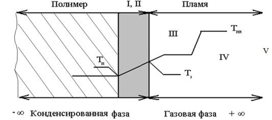 Для удобства анализа и исследования, сложный многостадийный процесс делят на временные и пространственные зоны, где протекают специфические физико-химические процессы: I – зона прогрева – в этой области полимер нагревается до температуры начала физико-химических превращений; II – зона химических превращений в конденсированной фазе, где протекают основные реакции разложения; III – предпламенная зона, в которой низкомолекулярные горючие продукты деструкции разлагаются на более мелкие частицы; IV – зона пламени, где выделяется основная часть тепловой энергии, наблюдается максимальная температура и световая эмиссия за счет высокой концентрации продуктов разложения; V – зона догорания это завершающая стадия большинства реакций окисления, и продукты реакций смешиваются с холодным воздухом.