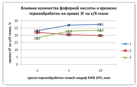 Из полученных результатов, табл. 1, рис. 2, видно, что наибольший привес ЗГ на ткань арт. 210 наблюдается при введении 1% фосфорной кислоты и времени термообработки 5 мин при температуре 155±5оС.