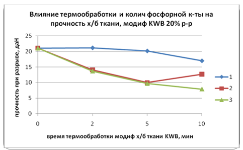 Исследование влияния модификации на прочностные свойств х/б ткани показало, рис. 3, табл. 2, что введение в модифицирующий раствор 1% фосфорной кислоты и термообработка в течение 2–5 мин не оказывает существенного влияния на прочность ткани.