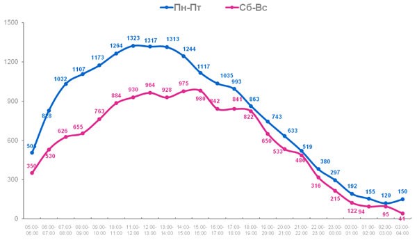 Стоит отметить, что целевая аудитория радиостанций распределена неравномерно в течение недели. Наглядно можно представить это на графике. Чаще всего радио слушают в будние дни – с понедельника по пятницу, нежели в выходные, а также в определенные часы – утром и в обеденное время (09:00-15:00), находясь в пробках, добираясь до работы или до дома, к вечеру число слушателей уменьшается.