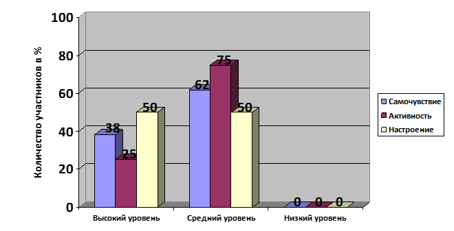 По методике САН (самочувствие, активность, настроение) В.А. Доскина, Н.А. Лаврентьевой, М.П. Мирошникова было выявлено, что у большинства женщин (15 человек, 62%) самочувствие с низким показателем - менее 39 единиц.