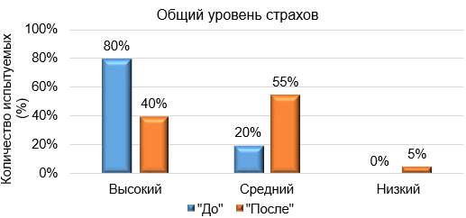 Сравнительная характеристика уровня страха «до» и «после» эксперимента осуществлялась с применением T-критерия Стьюдента, что позволило нам выявить статистически значимые различия.