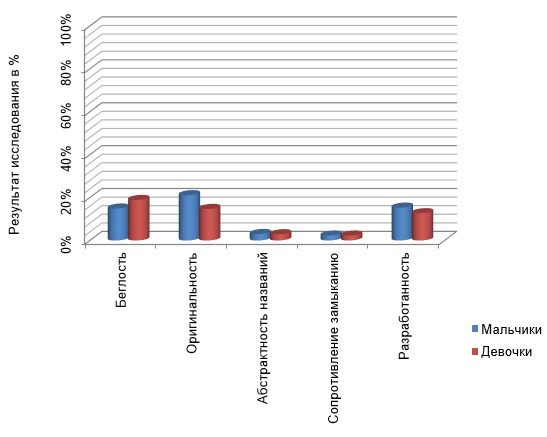 Во время проведения исследования, девочки, в отличии от мальчиков выполняли задания более продуктивно и старательно. Девочки, более усидчивые, более заинтересованы в итоговом результате. У девочек сформированность воображения выше, чем у мальчиков, но оно более стандартно и скуднее, если рассматривать с творческой стороны. Мальчики гораздо изобретательней, у них более развита фантазия, и нестандартное мышление. Результаты исследования мальчиков и девочек по показателям «вербальной креативности» несколько выше, чем по «невербальной креативности». Исключение составляет только результат исследования показателей вербальной беглости у девочек, который несколько ниже невербальной. Это связано с гендерными различиями, девочки дают меньше ответов за единицу времени, но удельный вес популярных ответов у них выше, чем у мальчиков.