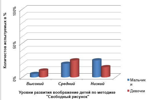Итак, комплексное проведённое исследование позволило не только выявить сформированность и гендерные различия у детей старшего дошкольного возраста, но и определить уровень развития воображения детей.