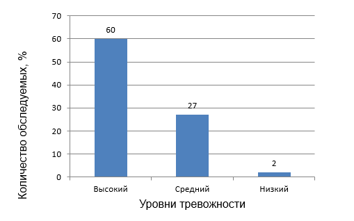 Как видно из представленных результатов, преобладающая часть обследуемых характеризуется высоким уровнем тревожности – 60% (9 человек), у 27% обследуемых (4 человека) наблюдается средний уровень тревожности и у 13% обследуемых (2 человека) преобладает низкий уровень тревожности.