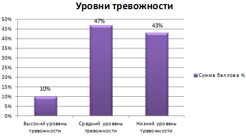 Мы видим, что средний уровень проявился на 37% больше высокого уровня тревожности и на 4% больше низкого уровня тревожности.