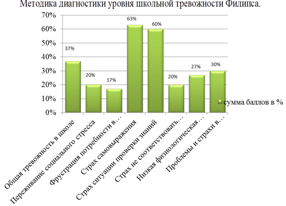 Рассмотрим результаты констатирующего эксперимента, полученные по методике изучения тревожности Филипса. Они представлены на рисунке 1,2.