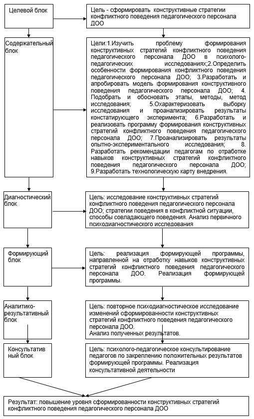 Целевой блок включает в себя постановку генеральной цели исследования формирования конструктивных стратегий конфликтного поведения педагогического персонала ДОО. Так же сюда относится теоретическое изучение психолого-педагогической литературы по проблеме исследования:выявление различных трактовок понятия конфликт, педагогические конфликты и конфликтного поведения, определение основных ученых, которые изучали данную проблему, выявление особенностей переживания педагогами конфликтных ситуаций в педагогической среде, определение факторов, участвующих с возникновения конфликтов с субъектами образовательного процесса, определение основных принципов формирующей деятельности в работе с педагогическим коллективом, подборка методов формирующей деятельности, которая способствует закреплению конструктивных стратегий конфликтного поведения педагогического персонала ДОО.