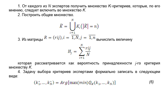 Эффективным методом для формирования критериев может оказаться, наряду с методом Делфи, и метод формирования критериев и альтернатив при помощи экспертного опроса [8]. В нем необходимо: