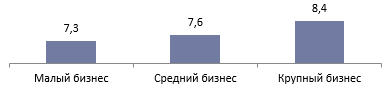 Осведомленность о порядке проведения налоговых проверок в среднем респонденты оценили в 7,4 балла из 10 возможных. Данная оценка указывает на наличие пробелов в информированности налогоплательщиков. При этом недостаток информированности более характерен для малого бизнеса в сравнении со средним и крупным (7,3 балла против 7,6 и 8,4 соответственно) (рисунок 1).