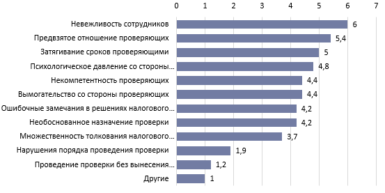54% респондентов отмечают, что особых проблем в процессе налоговой проверки у них не было. Среди выделенных проблем чаще отмечаются невежливость сотрудников (6%), их предвзятое отношение (5,4%), психологическое давление с их стороны (5%) и затягивание сроков проверки (5%) (рисунок 2).