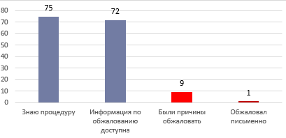 Результаты социологического исследования подтвердили, что большая часть респондентов, проходивших ликвидацию предприятия, знакома с процедурой подачи жалобы (75%) и считают, что информация по обжалованию доступна (72%). Но при этом, что причины жаловаться были у 9% предпринимателей, только 1% (10 человек из 84 имевших причины) обратились с жалобой. То есть только каждый восьмой подает жалобу. Это указывает на то, что органы государственных доходов не получают достаточной обратной связи о качестве работы своих подразделений, поскольку большая часть услугополучателей не сообщает о возникающих у них трудностях (рисунок 3).