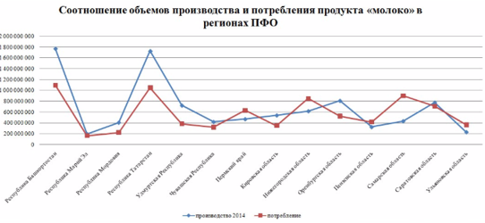 Анализ соотношения ресурсов регионов к потреблению для продукта «молоко» в регионах ПФО позволяет увидеть тенденцию большего производства «молока» в регионах ПФО, чем потребления. Есть предположение, что такая тенденция связана с тем, что продукт производится в домашних хозяйствах. Это говорит о возможности для последующей переработки и экспорта продукции.