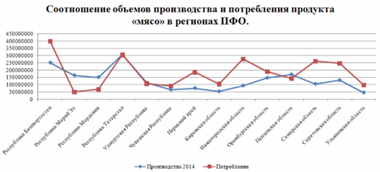 Соотношение же объемов производства и потребления продукта «мясо» в регионах ПФО говорит об обратной тенденции. Выбранные области потребляли мясо в большем количестве, чем производили, что подтверждает статистика объемов импорта мяса и мясопродуктов.
