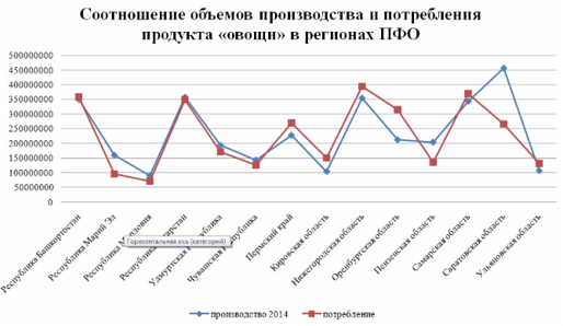 Рис.3. Соотношение объемов производства и потребления продукта «овощи» в регионах ПФО.