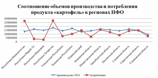 Рис.4. Соотношение объемов производства и потребления продукта «картофель» в регионах ПФО.