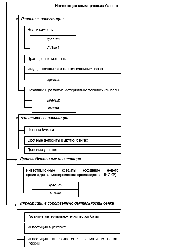 Для реализации указанных целей необходимо использовать различные инвестиционные инструменты. Виды и формы банковских инвестиций в отечественной практике отражены на рисунке 1.