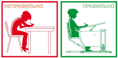 – неправильное положение тела во время уроков, выполнения домашних занятий и пр., которое мы рассмотрели выше. Длительное нахождение ребёнка в неправильном статическом положении приводит к нарушениям физиологического тонуса мышц, а в дальнейшем может стать причиной развития патологических искривлений позвоночника. Для следования этому требованию необходима правильная организация рабочего места школьника. Высота сидения и столешницы должны быть выставлены на оптимальную высоту с учётом роста ребёнка. Освещение рабочего места преимущественно спереди, слева и сверху. Кроме того необходимо регулярно, не реже одного раза в четверть, менять постоянное рабочее место каждого ученика в классной комнате. Причём перемещение должно быть не только по рядам, но и со сменой удалённости от классной доски.