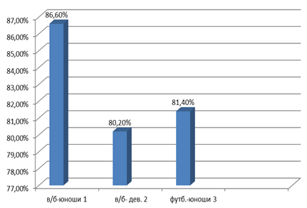Анализ результатов девушек и юношей, занимающихся одним видом спорта (волейболом), также не выявил различий в показателях точности оценки падения мяча: точность предсказания у девушек составила 80,2%, а у юношей-волейболистов 86,6%. Несмотря на разницу в 6,2%, статистически значимых различий не выявлено (Р˃0,05). Т.е. по точности предсказаний в стандартных условиях выполнения задания гендерные различия не оказали существенного влияния на качественные результаты пространственной антиципации у юношей и девушек, занимающихся одним видом спорта. Гендерные различия не были выявлены и при сравнении результатов девушек–волейболисток и юношей футболистов; результаты спортсменов статистически значимо не различались (Р˃0,05): 80,2% у девушек и 81,4% у юношей футболистов (рис.1).