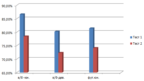 Анализ результатов выполнения второго теста, который предполагал более сложные условия выполнения задания, выявил различия в проявлении антиципации у спортсменов разных видов спорта. В данном виде задания оценивались два показателя: точность предсказания и время выбора зоны падения мяча. Полученные результаты показали, что усложнение задания привело к снижению точности предсказания пространственной антиципации у всех испытуемых спортсменов. Так, у юношей и у девушек–волейболистов, а также у юношей–футболистов наблюдается тенденция к снижению точности предсказания места падения мяча по сравнению с результатами первого теста. Точность предсказания у юношей-волейболистов составила в среднем 78,4%, у девушек – 72,3%, у юношей-футболистов – 74,1%. При этом не выявлено статистически значимых различий в снижении точности пространственной антиципации по гендерному признаку [11]. Пространственная антиципация снизилась у всех спортсменов, не зависимо от вида спорта и гендерной принадлежности. Спортсмены показали, что недостаточно готовы к предвидению возможных неожиданных технических действий в условиях сложного выбора реакции, что является основой игровых действий в спортивно-игровых видах спорта. При этом ожидания того, что результаты у юношей футболистов будут статистически достоверно ниже, чем у волейболистов в связи с тем, что это разные игровые виды спорта и имеет место разная работа с мячом как в техническом, так и в пространственном плане, не оправдались. Имеющееся преимущество в точности предсказаний у юношей-волейболистов по средним результатам статистически не достоверно (Р˃0,05). По-видимому, невысокий уровень спортивной квалификации спортсменов еще не позволяет в полной мере доминировать профессиональным особенностям конкретного вида спорта, а работа с мячом, хотя и разной направленности, не вызывает чувства неуверенности и непонимания условий выполнения заданий (рис.2).